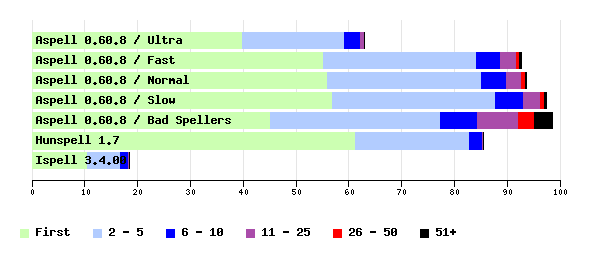 | Aspell 0.60.8 / Ultra | 0 | 0 | 1 | 3 | 10 | 31 | 98 |